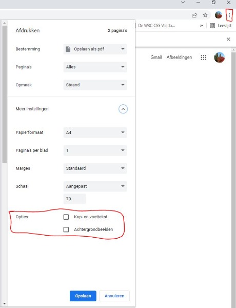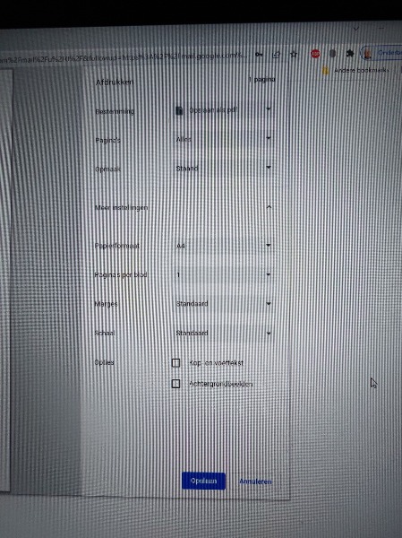ik zie denk ik dat je een *.pdf bestand wilt afdrukken en dan werkt de instellingen anders. Zorg dat je gewoon Google Chrome opent, dus niet vanuit een document, bijvoorbeeld nieuw tabblad, en dan Afdrukken -> Meer instellingen en onderaan de vinken weghalen als die er staan.