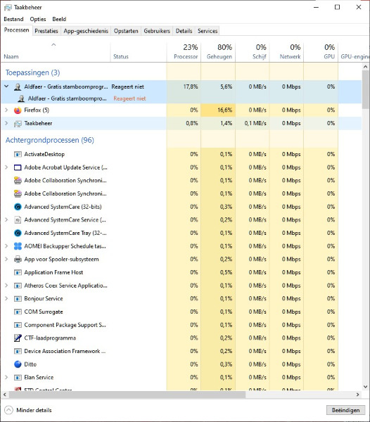 Via Taakbeheerplaatje zie ik dat Aldfaer.exe twee keer is opgestart, waarvan de tweede een instantie is van de eerste.