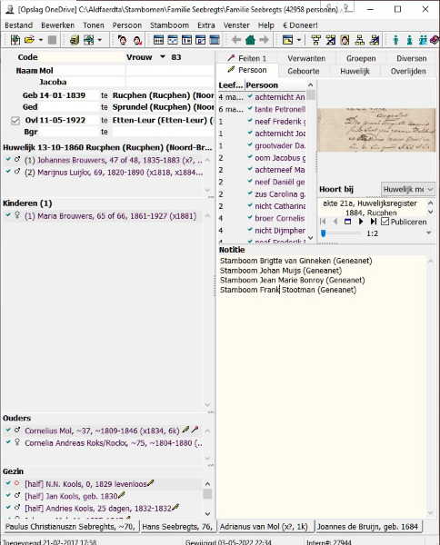 Je kunt natuurlijk zelf een kopie van het bestand in OneDrive zetten, maar als je Aldfaer start heb je dan een stamboom geopend die in OneDrive staat? Dat zie je aan de blauwe bovenbalk van Aldfaer .