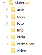 De map Materiaal is de hoofdmap welke meerdere submappen kan bevatten, een voorbeeld in bijlage. Aldfaer leest alle bestanden uit de map waarvan het pad in Stamboom > Eigenschappen is aangegeven.