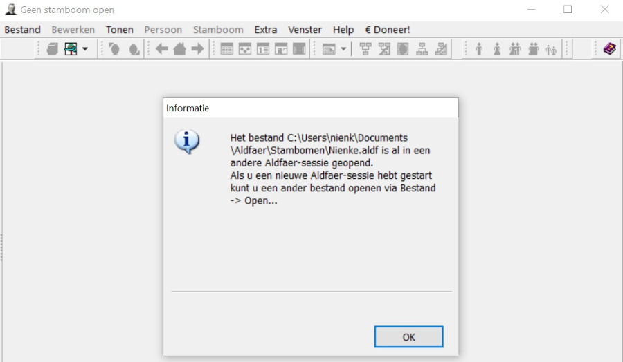 Je het het programa Aldfaer. Is het programma geopend dan kan het programma een bestand inlezen, dit zijn je genealogie gegevens. Indien je een back up maakt van het bestand zou je bestand kunnen crashen maar dan heb je nog altijd je back up die je dan kan inlezen.