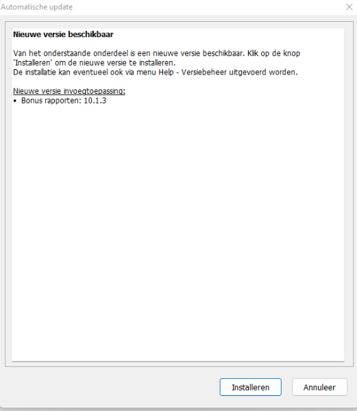 Wat zegt Menu > Help > Versiebeheer Invoegtoepassing > Bonus rapporten links onder voor versie nummers?