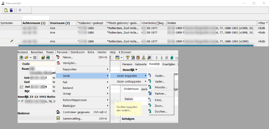 Voor het koppelen van Kinderen , Partners, Ouders moet u eens proberen met de rechtermuis in het linker respectievelijke vak te klikken; dus rechtsklik in het Kindervak.