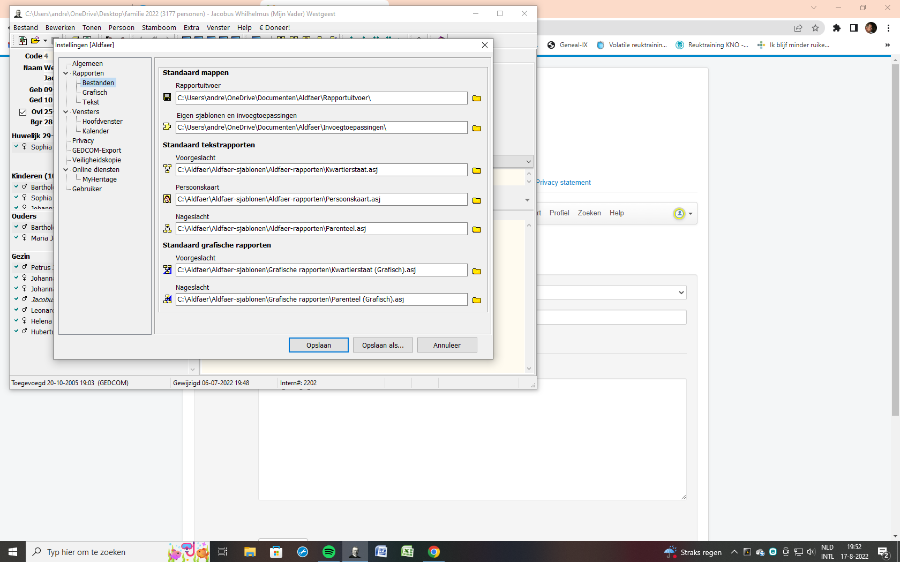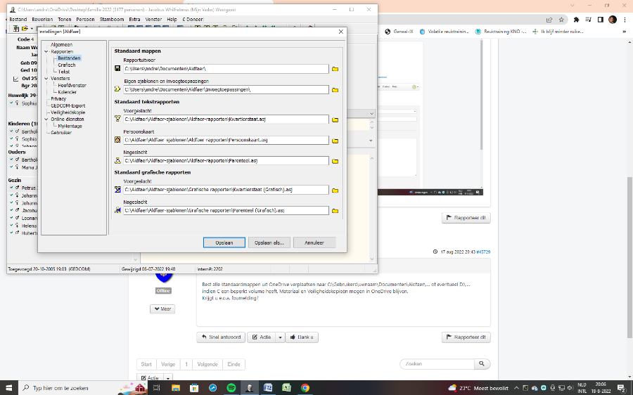 Heeft u ook de stamboom uit OneDrive verwijderd en in de map C:\Users\andre\Documents\Aldfaer\Stambomen\ geplaatst. Zo niet, eerst doen, zo ja, open het bestand via Bestand > Open > navigeer naar de stamboom > Openen.