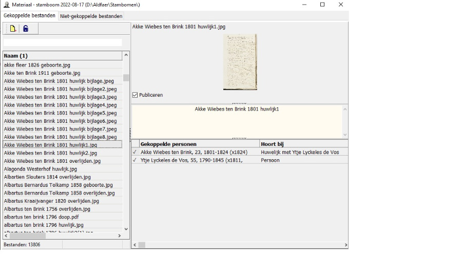 u vergelijkt de bestandsnaam "Akke Wiebes ten Brink 1801 huwlijk1.jpg" met het onderschrift "Akke Wiebes ten Brink 1801 huwlijk bijlage8" . Het onderschrift staat volledig los en kunt u wijzigen dan wel gewoon weglaten.