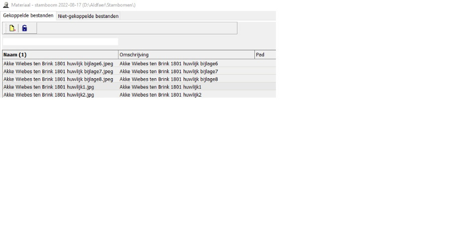 In de weergave wordt onder naam de bestandsnaam getoond en onder Omschrijving de tekst welke gebruikt wordt als onderschrift van de koppeling van de eerste persoon.