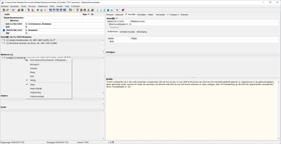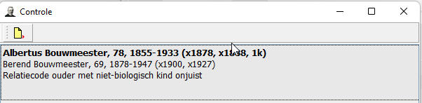 Wel valt mij nu iets op. Ik zie niet [wettig] (1 biologisch), zoals ik bij de anderen zie staan, terwijl bij de moeder staat dat ze de biologische moeder is van Berend. Ik ga ontkoppelen en opnieuw koppelen van het kind.