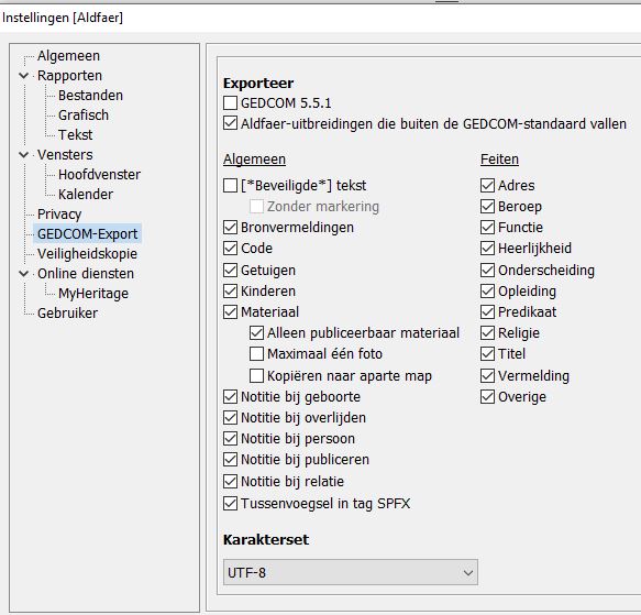 Of de instellingen voor GEDCOM overeen komen met onderstaande afbeeldingen.