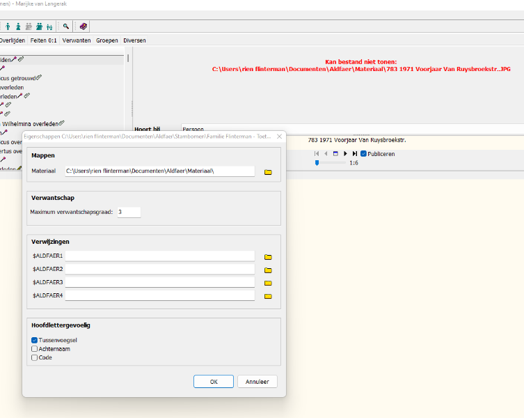 Wederom onder Stamboom -> Eigenschappen surfen naar de map waar het fotomateriaal staat. Als u slechts hier en daar fotomateriaal mist dan moet u eens kijken waar u nog meer fotomateriaal heeft en dat materiaal in de Aldfaer map voor materiaal zetten.