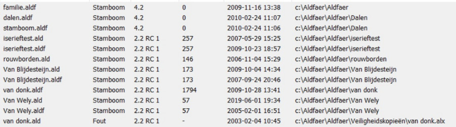 De bekomen lijst toont de versies van de stamboombestanden en veiligheidskopieën. Stuur deze lijst als bijlage.