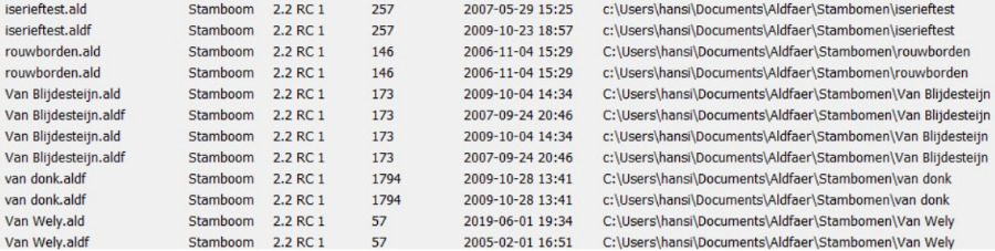 Zoek naar de bestanden met Bestand > Zoek Aldfaer-Aladfaerbestanden, vink stambomen en Veiligheidskopie aan en alle schijven.
