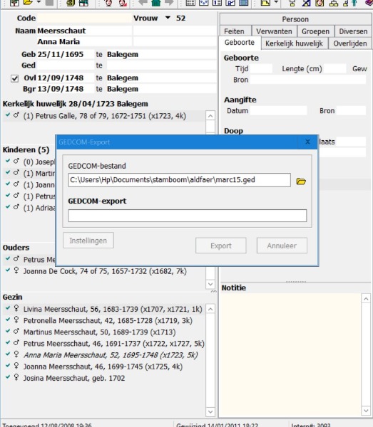 Dat doe ik. Dan moet de gedcomfile aangeduid worden ( in mijn geval marc15.ged ), vraag om te mogen overschrijven, indien ja, exporteer en dan blokkeert alles. Ik kan uit geen enkel hulpscherm en hoofdscherm meer geraken en moet finaal via taakbeheer Aldfaer sluiten