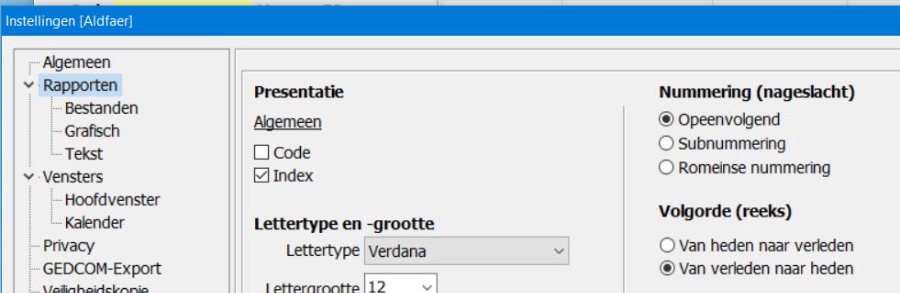 Voor Aldfaer-rapporten kan je de generatievolgorde omdraaien doch uitsluitend voor reeksen. In de Instellingen op het blad Rapporten kan je kiezen tussen een overzicht van heden naar verleden (opklimmende reeks) en een van verleden naar heden (afdalende reeks).
