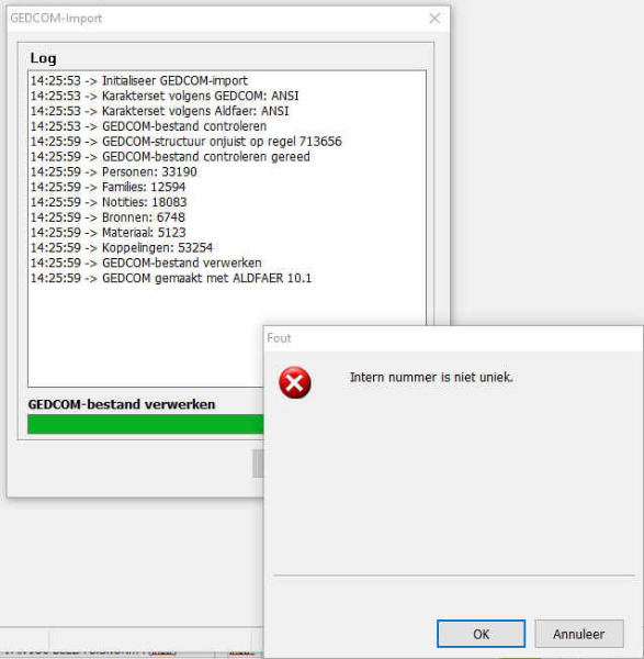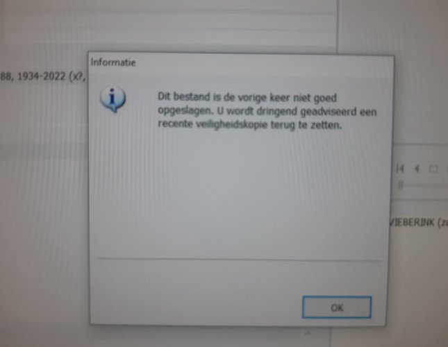 Goedendag. Al een paar weken 'moeilijkheden' met Aldfaer. Als ik programma opende verscheen pop-up scherm met 'Dit bestand is de vorige keer niet goed opgeslagen. U wordt dringend geadviseerd een recente veiligheidskopie terug te zetten.' De ze gaf dan zelfde probleem. Gelijk na die pop-up verscheen melding 'U wordt geadviseerd Stamboom -> Bestand opschonen uit te voeren en dat lukte ook niet, kwam niet verder. Als ik nu een GEDCOM wil importeren krijg ik de melding 'Inter nummer is niet uniek.' M.a.w. ik kan niks meer, niets invoeren maar ook geen gegevens terughalen.Vriendelijke groet, Jan Geerts