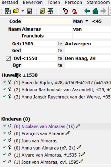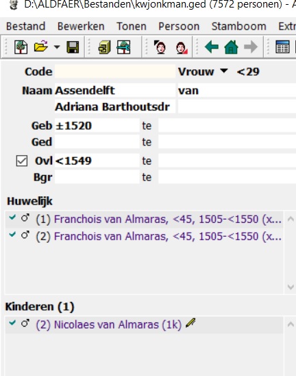 Nee helaas, ik denk dat er een fout in mijn programma zit, krijg ook melding dat het verkeerd is afgesloten. Gebruik aldfaer al jaren en dit nog niet eerder gehad. Heb het net nog een keer geprobeerd. Adriana Baarthoutsdr van Assendelft geopend, toevoegen zoon, Nicolaes gekozen door dubbelklik in de lijst, Gevolg een tweede huwelijk van Franchois van Almeras met echtgen van Adriana en vermelding van Nicolaes als zoon uit dit tweede huwelijk.