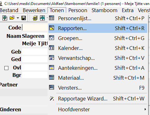 Bovenstaande toont het openingsscherm van aldfaer en kies daar Tonen en daarna op Rapporten...