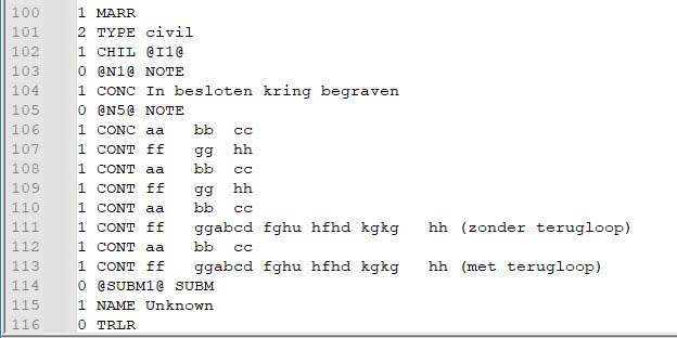 Maar de tekst die ik overneem uit alledrenten.nl bevat tabinstellingen en wanneer ik die exporteer via GEDCOM is het resultaat in genealogieonline: