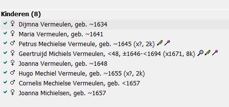 In het hoofdscherm van een persoon staat in het linkerpaneel in het midden een overzicht van de kinderen van de hoofdpersoon. Van de kinderen wordt de geboortedatum aangegeven, of -indien die niet beschikbaar is- de doopdatum.