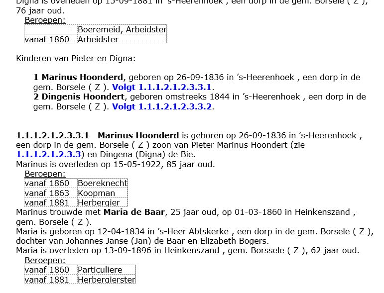 KS. Voor het maken van bijv een parenteel in boekvorm maak ik gebruik van een rapportvorm met dezelfde naam.. Dit sla ik op als html en open het vervolgens met Word. Dat gaat prima alleen blijven er hinderlijke kaderlijnen ( stippellijnen ) zichtbaar. Zie bijlage.