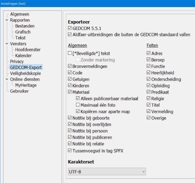 De Instellingen zijn ook via Exporteer GEDCOM te bereiken.