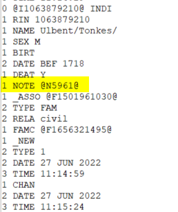 Een Note property kan op meerdere plaatsen in een Gedcom bestand staan, bijvoorbeeld als onderdeel van een geboorte, als onderdeel van een huwelijk, enzovoorts enzovoorts. Het is dus altijd onderdeel van.