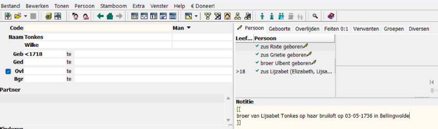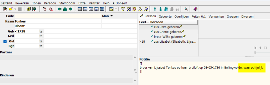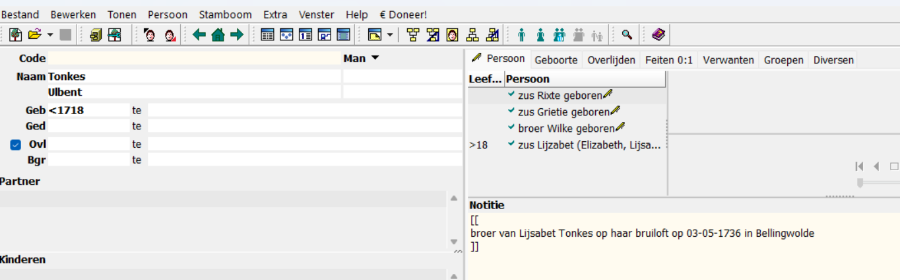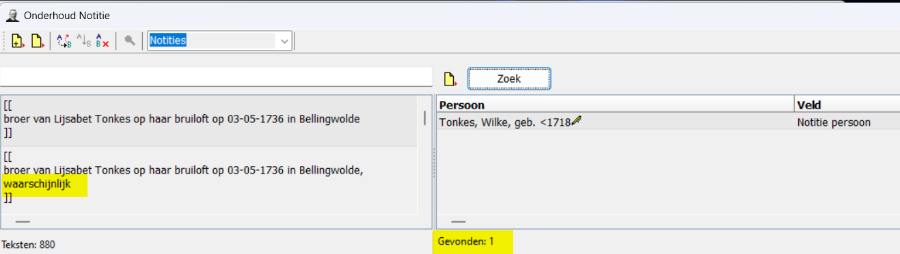 Gaan we nu in Aldfaer editen, dus we gaan slechts bij 1 van beide personen de Note wijzigen, dan zien we ineens in de Onderhoud-Notities dat de oorspronkelijke NOTE nog maar naar 1 persoon verwijst en niet naar 2. En dat er een nieuwe NOTE is bijgekomen in de tabel, namelijk de gewijzigde.