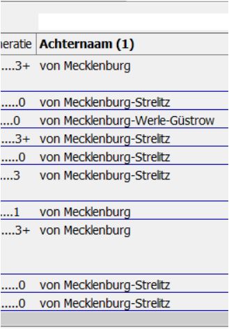 Dat kunnen ook meervoudige achternamen zijn. Reden dat naar mijn mening gebruik van de eerste van de achternamern de voorkeur heeft opdat men binnen het zelfde geslacht met één en dezelfde achternaam kan zoeken zoals onderstaand getoond wordt. En dus niet met verschillende zoeknamen
