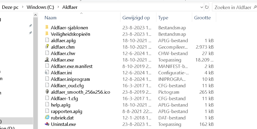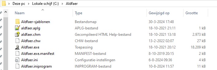 Kunt u nagaan welke datum bij u voor de toepassing Aldfaer.exe staat in de getoonde map en ook of die map C:\Aldfaer deze bestandnamen voorkomen?,