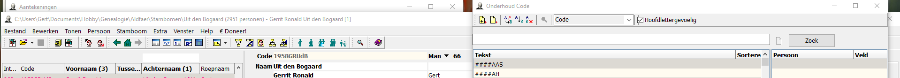 2. Ik heb altijd "Stamboom - onderhoud" open staan, ook als ik het hoofdscherm van Aldfaer afsluit. Als ik nu bij versie 11 Aldfaer weer opstart staat altijd "Code" geselecteerd, terwijl bij versie 10 de laatst gebruikte geselecteerd stond. >> Ik vond het oude prettiger omdat ik meestal "Bronnen"," of "Notities" gebruik, verder niet zo spannend, maar als het te verhelpen is graag.