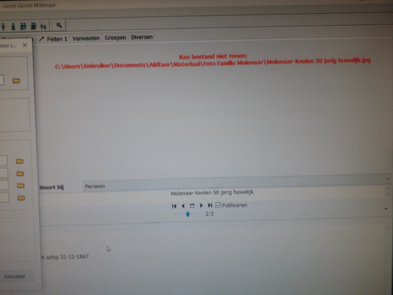 Kunt u eens een screenshot maken van Stamboom/Eigenschappen èn van het hoofdscherm waar waarschijnlijk in rood staat dat de foto niet kan gevonden worden.