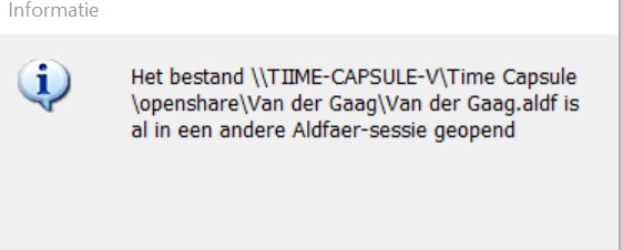 Hallo, op de een of andere manier is aldfaer niet goed afgesloten en blijf ik de melding ontvangen dat er in een andere sessie al het stamboom bestand is geopend.