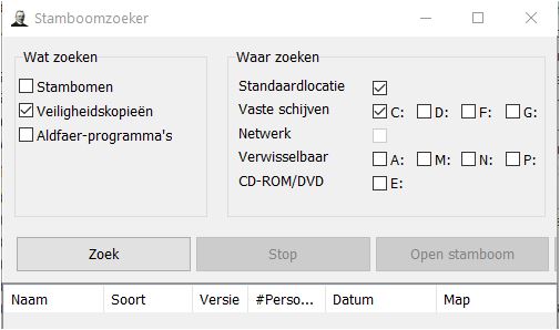 menu Bestand > Zoek Aldfaerbestanden > vinken zoals in zie bijlage, ook de andere aangesloten schijven. Een lijst van veiligheidskopieën zal getoond worden in het onderste vak. Klik op veiligheidskope met de jongste datum en vervolgens klik op 'Open stamboom' .