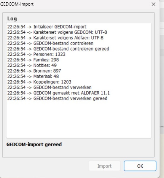 Bedankt voor de info. Maar als ik het gedcombestand van mijn echtgenote probeer te importeren in (veiligheidshalve) een veiligheidscopie van mijn stamboom, krijg ik volgende melding: