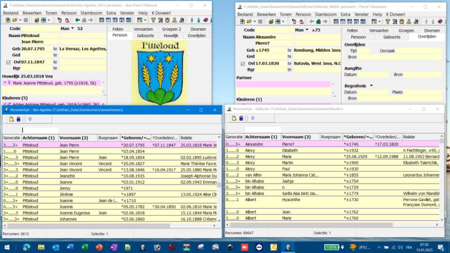 Ik gebruik Aldfaer voor mijn stamboomlijn en heb deze in een bestandsnaam opgeslagen en gebruik deze stamboomlijn om er verbeteringen in aan te brengen. Daarnaast heb ik ook een bestandsnaam gemaakt voor de familielijn van mijn overleden echtgenote. In beide familielijnen komt de naam Suijkerbuijk (met verschillende schrijfwijze) voor. De "familienaam Suijkerbuijk" is bedacht door een banketbakker in Nispen/Essen. Hij bakte suikerbroodjes en noemde dit broodje 'suijckerbuijckje' de kinderen in zijn huwelijk noemde hij "Suijckerbuijck" en staan met deze naam zo in het doopregister. Dus, eenieder met de familienaam Suijkerbuijk (of andere schrijfwijze) stamt af van deze banketbakker. Nu wil ik deze familielijn van het ene Aldfaer-bestand overzetten / kopiëren naar het andere Aldfaer-bestand. Ik kan geen twee Aldfaer-bestanden op één computer naast elkaar openen; hoe doe zet ik die persoonsgegevens over / hoe kopieer ik deze personen met hun gegevens?