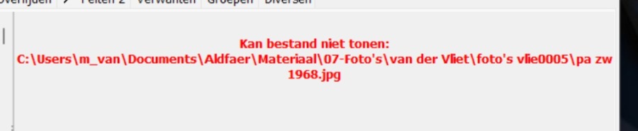 Bij enkele personen had ik al een foto geplaatst, maar ik krijg in rode letters de tekst: Kan bestand niet tonen en daaronder het pad waar het materiaal stond.