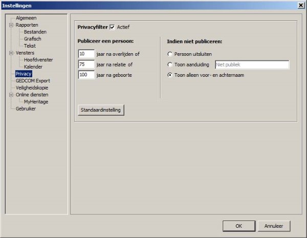 De goedkoopste methode is een gratis account openen bij geneanet.org en vervolgens een gedcom opladen. Hierbij ga ik er van uit dat u het privacy filter gebruikt. Mijn persoonlijke instellingen zijn als hieronder getoond, waarbij ik mij bewust ben dat de instelling "Toon alleen voor- en achternaam" op het randje van aanvaardbaar is want zelfs daarvoor dien je eigenlijk eerst toestemming te vragen. Maar met mijn bestand van rond 55'000 personen is dat geen haalbare zaak