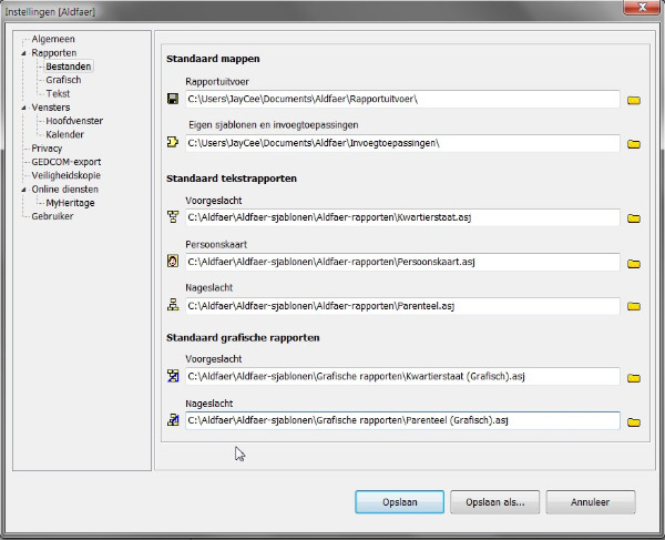 Ik heb de verschillende eerdere topics hierover gelezen en besef dat er iets fout staat op mijn C-schijf. Echter, ik ben niet zo goed op de hoogte van de informatica en heb schrik dat als ik iets ga verschuiven op mijn PC, het programma Aldfaer op den duur helemaal niet meer werkt. Daarom voeg ik in bijlage prt-scrn toe van het blad Extra>Instellingen>Rapporten>Bestanden.