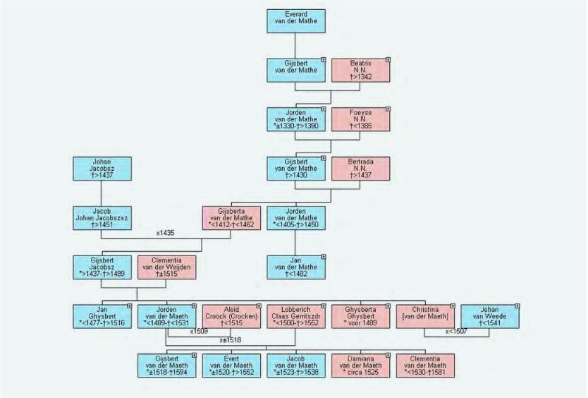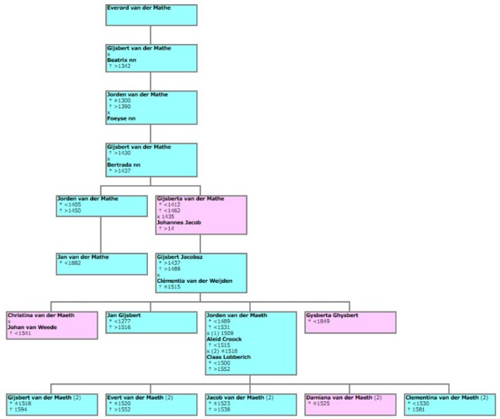 Gijsbertha van der Mathe is de zuster van Jorden van der Mathe gehuwd 1435 met Jacob Johan Jacobszsz en daarvan hun parenteel.