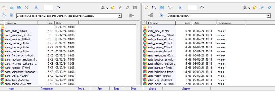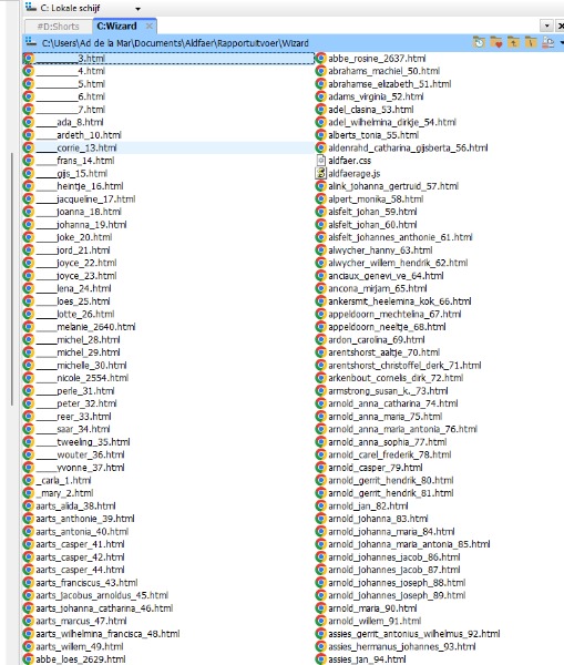 Ik heb de indruk dat op de website de persoonskaarten in een niveau te diep zitten. Het plaatje laat zien \httpdocs\perskrt\ maar in deze alfabetische listing is dan mis ik een bestandje aldfaer.css. Staat de index.html en naam.html en fotovenster.htm e.a. ook daar? Waarschijnlijk niet.