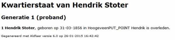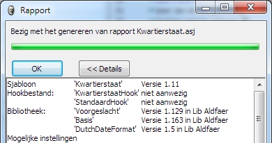 Houd de toets Ctrl van het toetsenbord ingedrukt en klik dan op het icoon waarmee een kwartierstaat gemaakt wordt. Dan verschijnt het rapportvenster. Klik daarin op Details als er geen wit vlakje met tekst te zien is in dit venster. Wacht tot de OK-knop verschijnt.