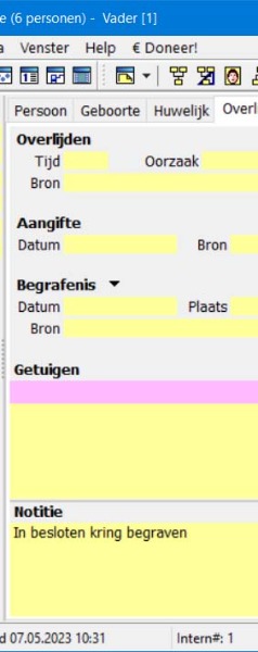 En mijn vraag is: komt daarvoor nog eens een mogelijkheid, want ook in "notities overlijden" zie ik geen mogelijkheid daarvoor (ja, onbekend kan ik invullen, maar dat is niet bedoeling)