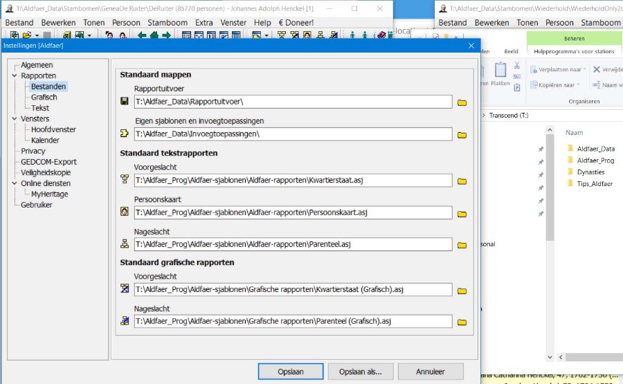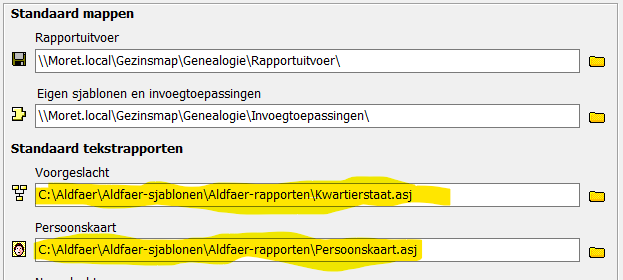 Na de start van Aldfaer moet u alleen weer de stamboom via 'Open' openen waarna Aldfaer die locatie onthoudt bij afsluiten. Ook de eigen locaties voor rapportuitvoer en eigen sjablonen moet gecontroleerd/gecorrigeerd worden.